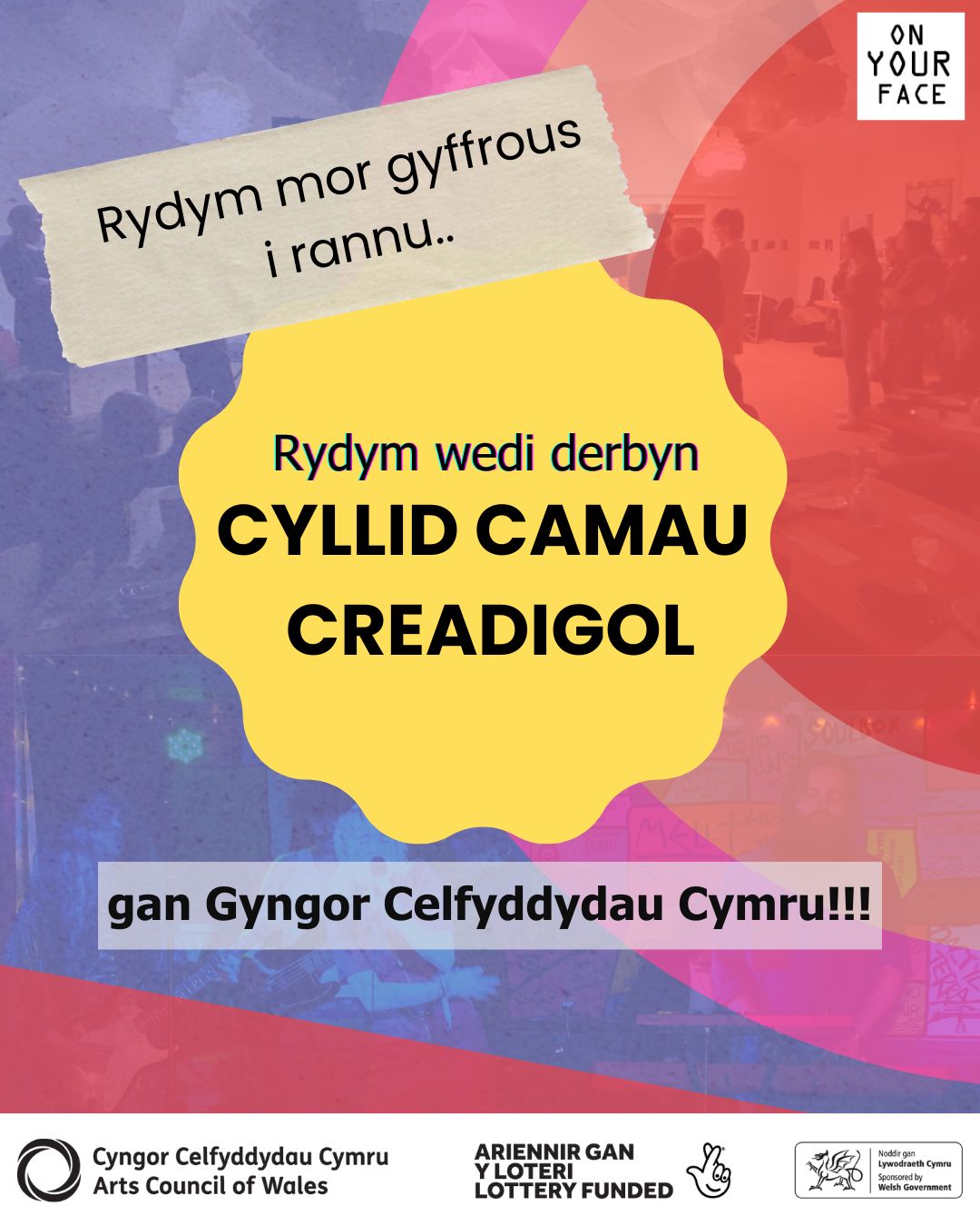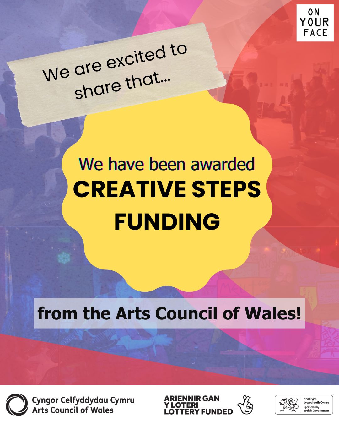 Rydym mor gyffrous i rannu bod On Your Face Collective wedi bod yn llwyddiannus yn ein cais Camau Creadigol gyda Chyngor Celfyddydau Cymru. 📣📣📣🌈🏴